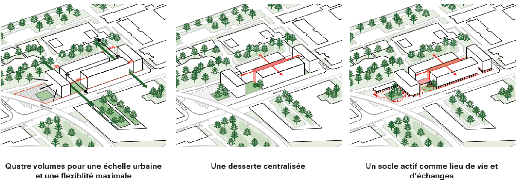 Le fractionnement du programme en quatre volumes reliés par un atrium central vitré, lieu de vie, d’échanges et de croisement entre les différents occupants, permet de générer des interstices et des percées visuelles qui favorisent l’articulation du programme avec son quartier. Ces interstices accueillent des cours jardins et des escaliers à l’air libre. Sur le Boulevard Nord, la transparence des différentes séquences programmatiques du rez-de-chaussée animent et rythment la promenade : parvis végétal, porche d’entrée, cour jardin, restaurants, espaces de production.