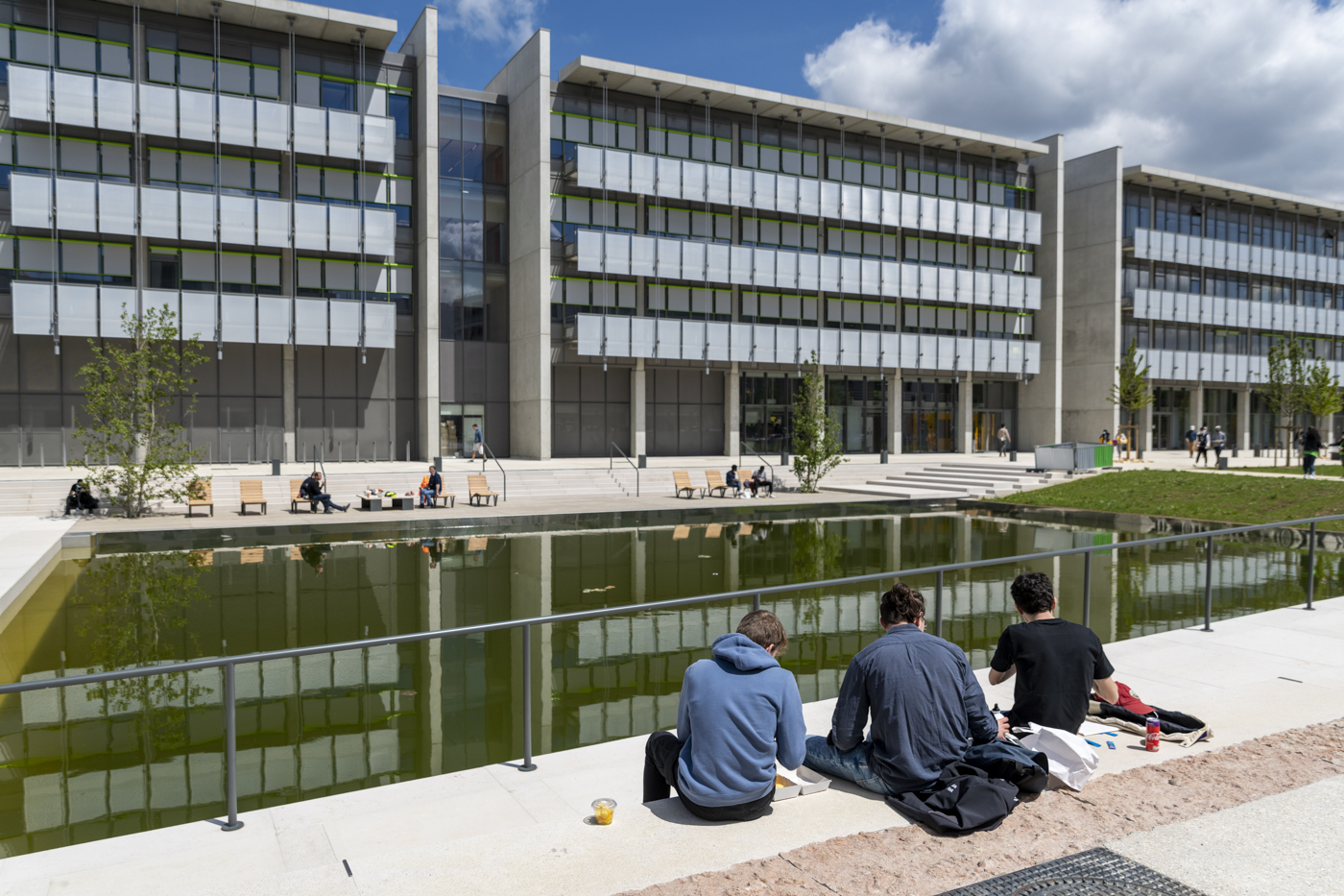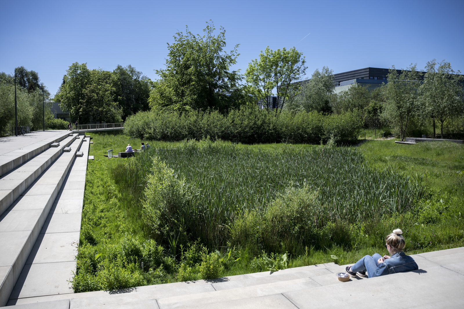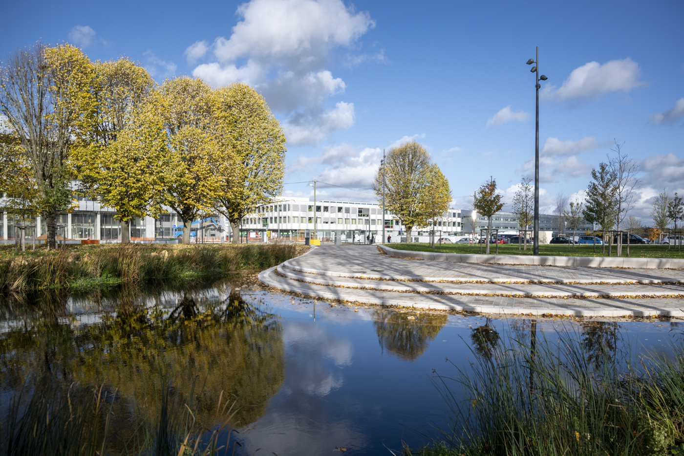 Le bassin Nord du Parc de Moulon a lui aussi été pensé pour stocker le surplus d’eaux pluviales et le redistribuer progressivement à la végétation alentour. Lieu d’agrément, il collabore au rafraichissement naturel des espaces publics pour lutter contre les ilots de chaleur urbains.
