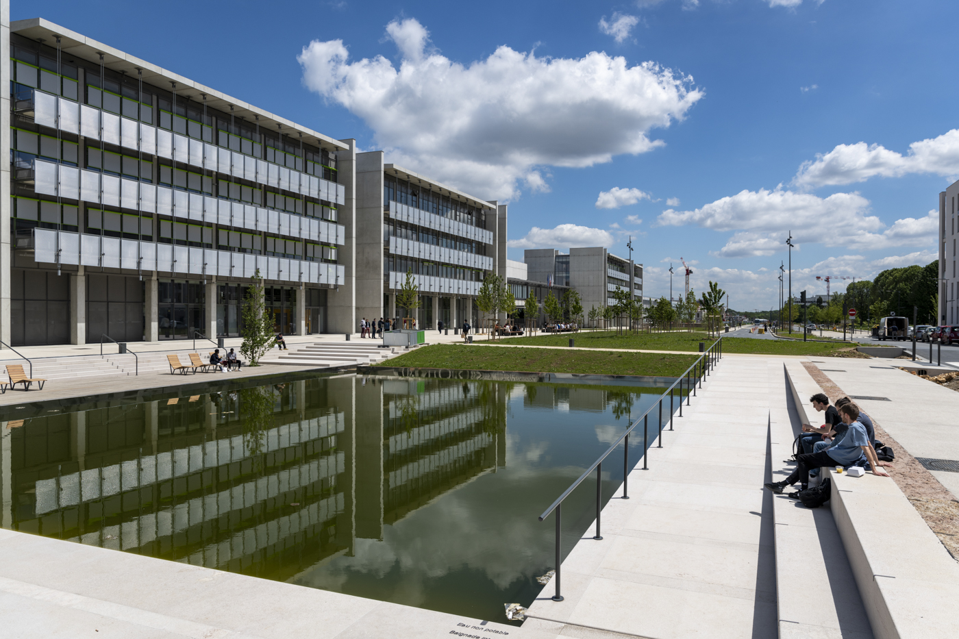 Le plan d’eau permanent situé devant l’ENS Paris-Saclay (quartier de Moulon) est atypique car maçonné. Il stocke les eaux pluviales avant qu’elles ne repartent dans un dispositif de fossés, qui tamponnent ces eaux avant de les rejeter avec un débit limité de 0,7 L/s/ha.