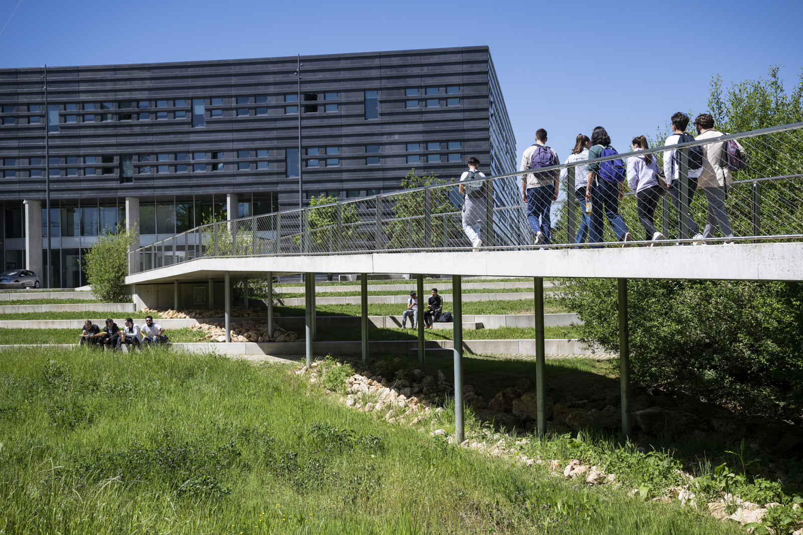 Récompensé par la Victoire du Paysage en 2020, le Jardin Argenté se distingue par sa topologie particulière en creux et sa surface végétale peu revêtue pour assurer un maximum de perméabilité malgré un sol argileux, permettant un déplacement progressif de l’eau depuis le bâtiment de CentraleSupélec jusqu’à l’entrée du Learning Center – Lumen (avenue des sciences).
