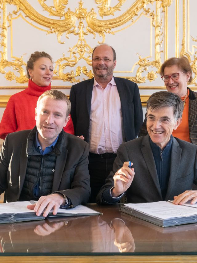 Signature du contrat par Jean-Philippe Dugoin-Clément, vice-président de la Région Île-de-France en charge du logement, de l’aménagement durable du territoire et du SDRIF-Environnemental et François de Mazières, président de Versailles Grand Parc, maire de Versailles, en présence de Philippe Van de Maele, Directeur général de l’EPA Paris-Saclay.