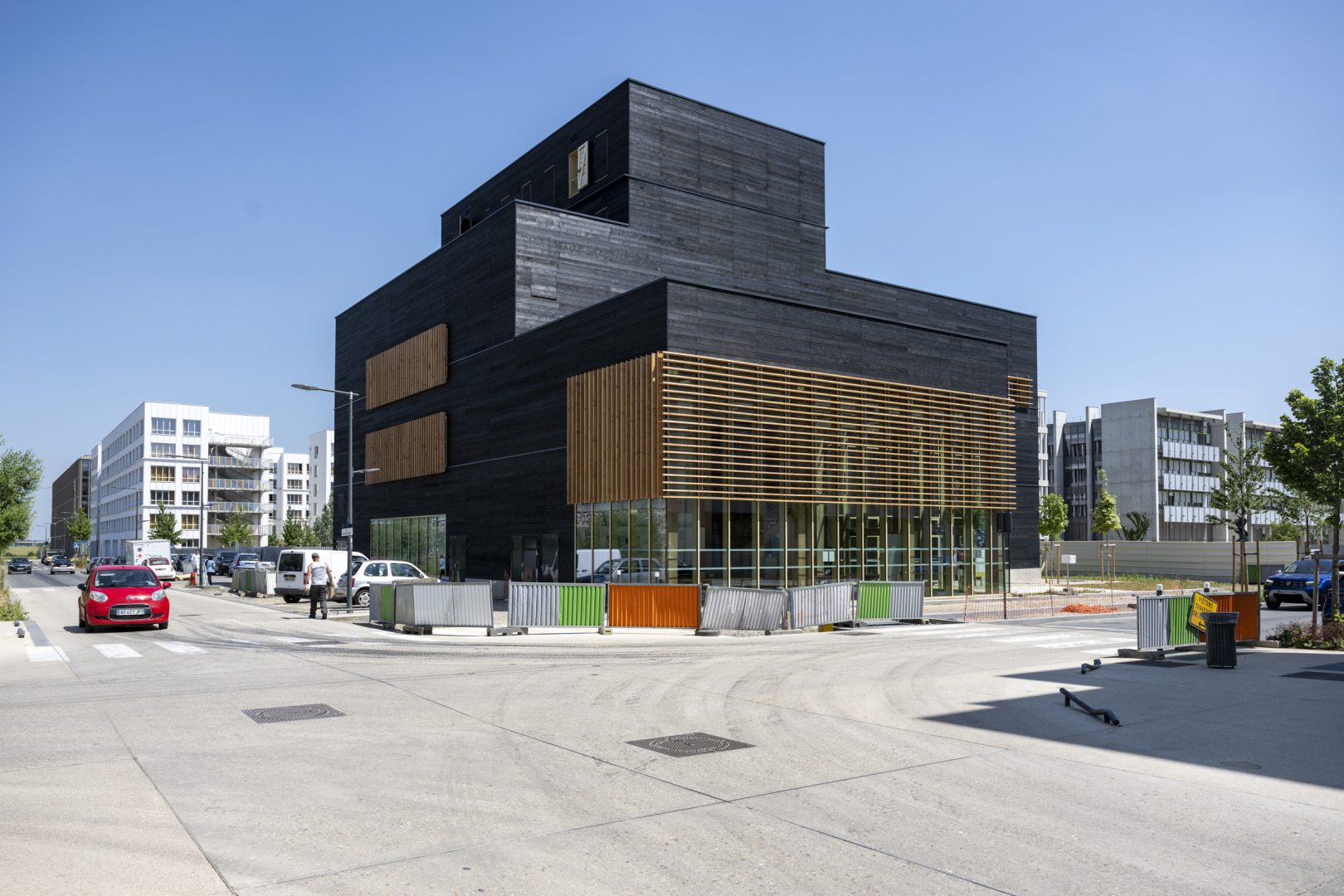 La structure du bâti est réalisée en bois. La partie centrale est en terre cuite, issue de productions locales, pour permettre la régulation des températures de manière naturelle. L’ensemble est recouvert d’une façade en bois brûlé, avec des jeux de transparence, des vitres et de nombreuses terrasses utilisables par tous, public et étudiants du centre.